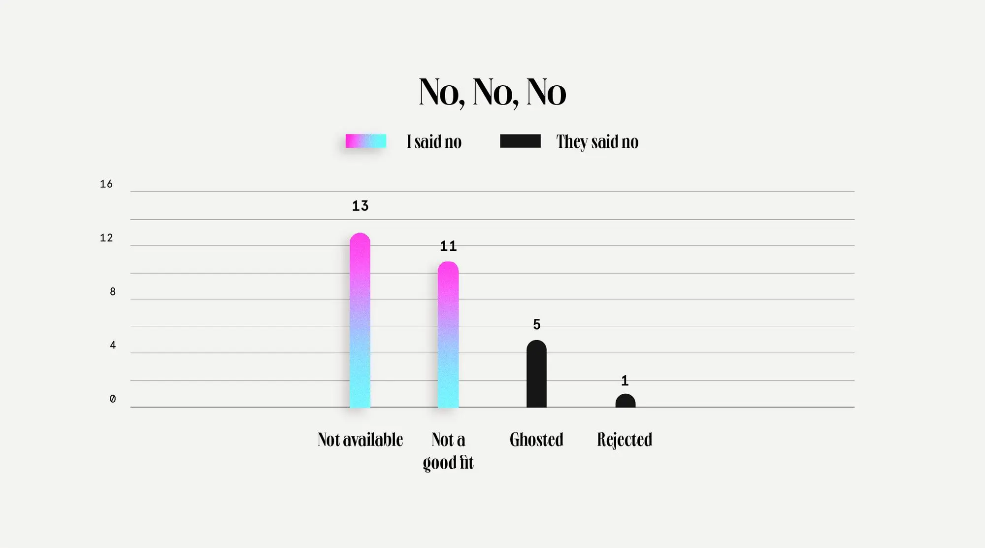 I've also heard that one is supposed to only take 30% of all inquiries. Right now, I'm saying no 48% of the time. Next year: saying more "no" is the goal!